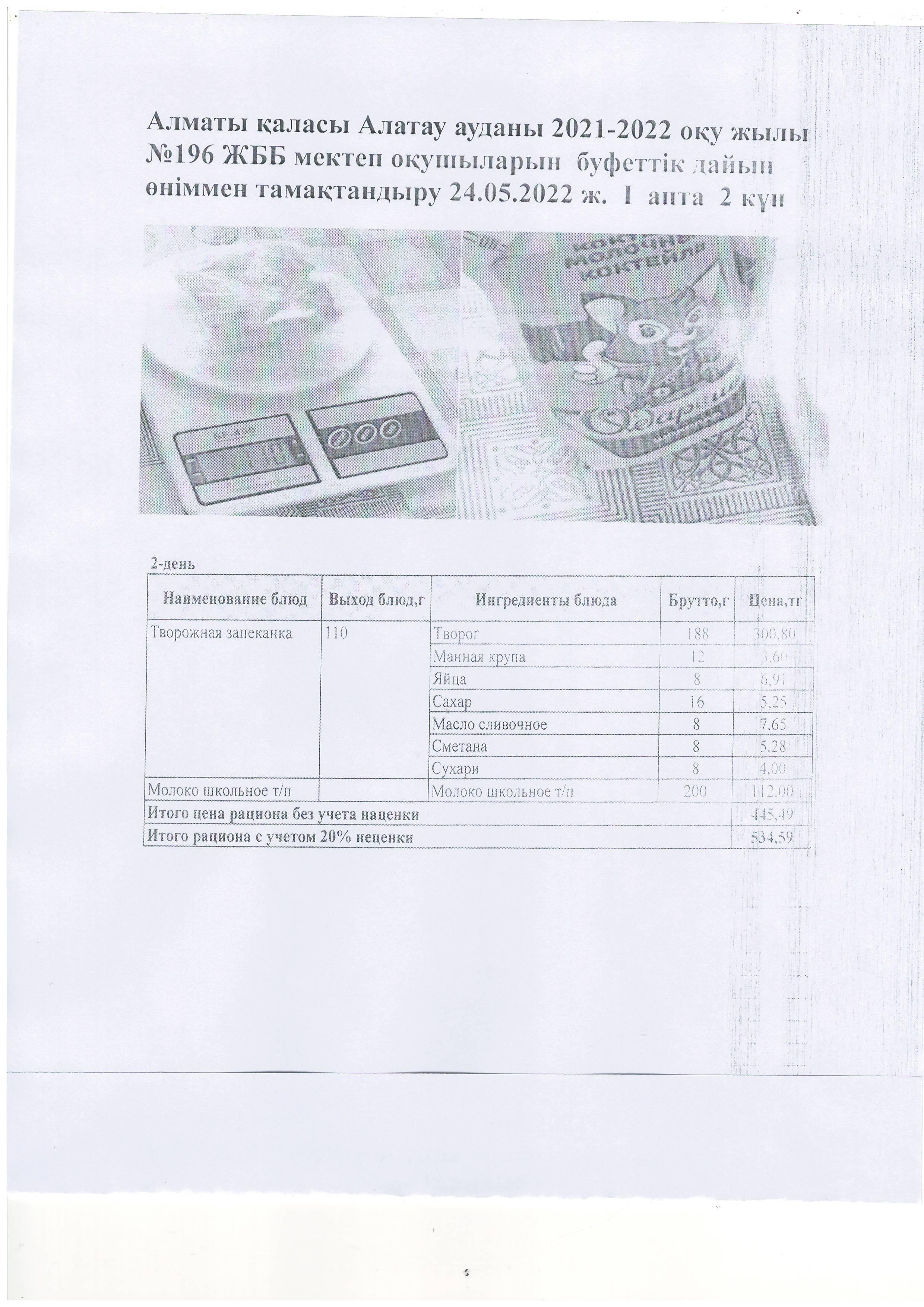 Алматы қаласы Алатау ауданы 2021-2022 оқу жылы №196 ЖББ мектеп оқушыларын буфеттік дайын өніммен тамақтандыру 24.05.2022 ж. І апта 2 күн